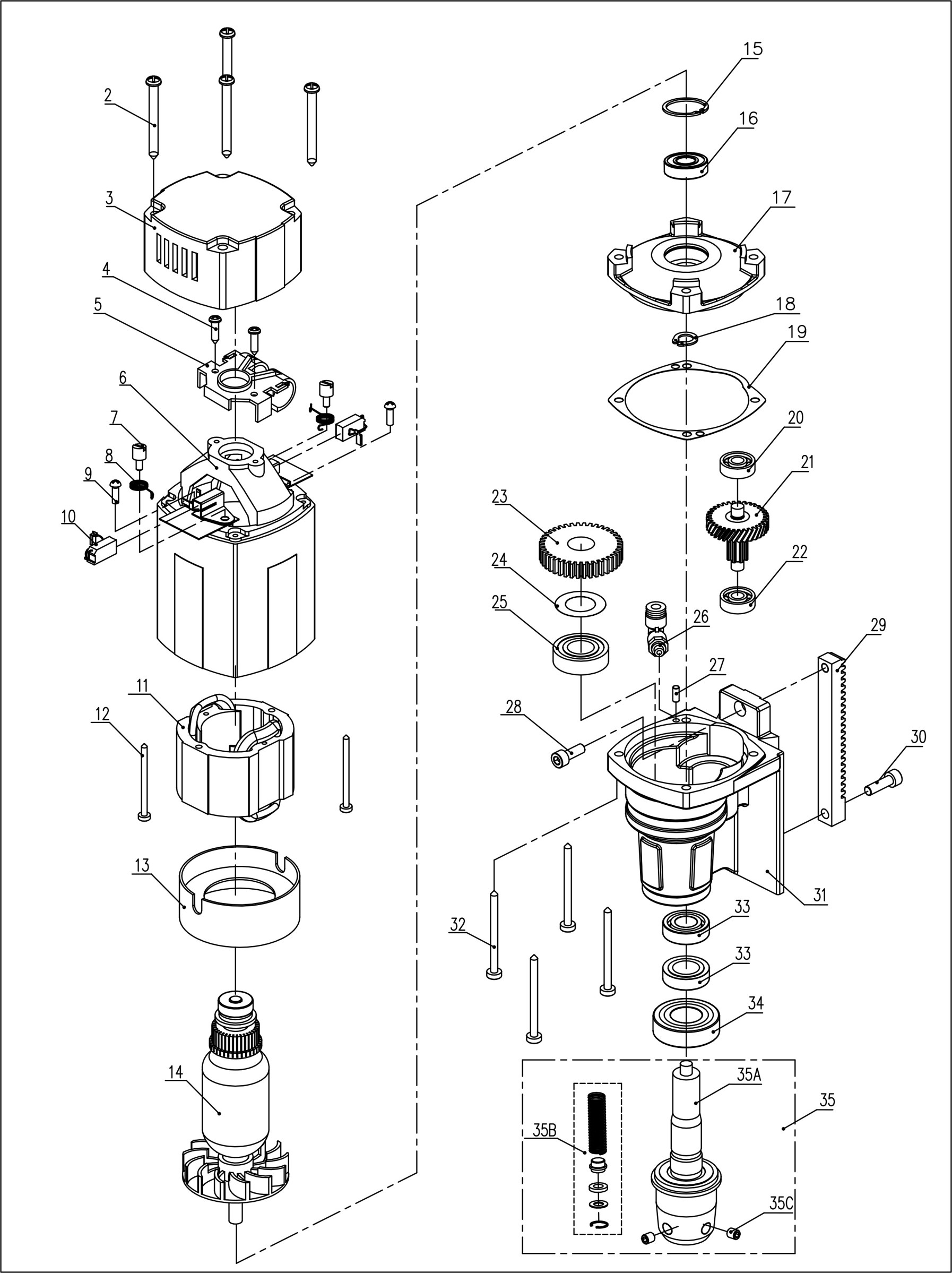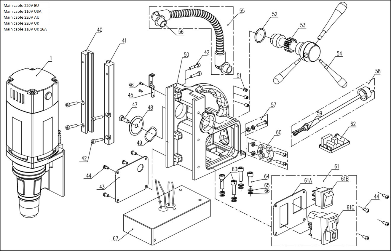 Magnetbohrmaschine, Kernbohrer max. Durchmesser 30 Millimeter, Stromversorgungsspannung 220 - 240 Volt, Drehrichtung im Uhrzeigersinn.