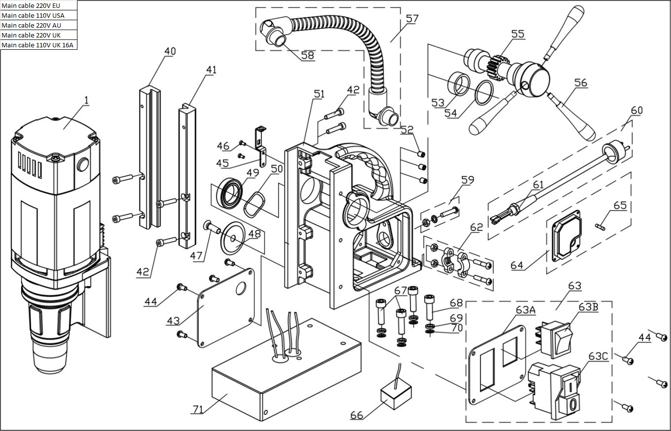 Magnetic drilling machine, annular cutters max. dia 30 millimeter, power supply tension 220 - 240 Volt, power supply frequency 50 - 60 Hertz, rotation direction clockwise.