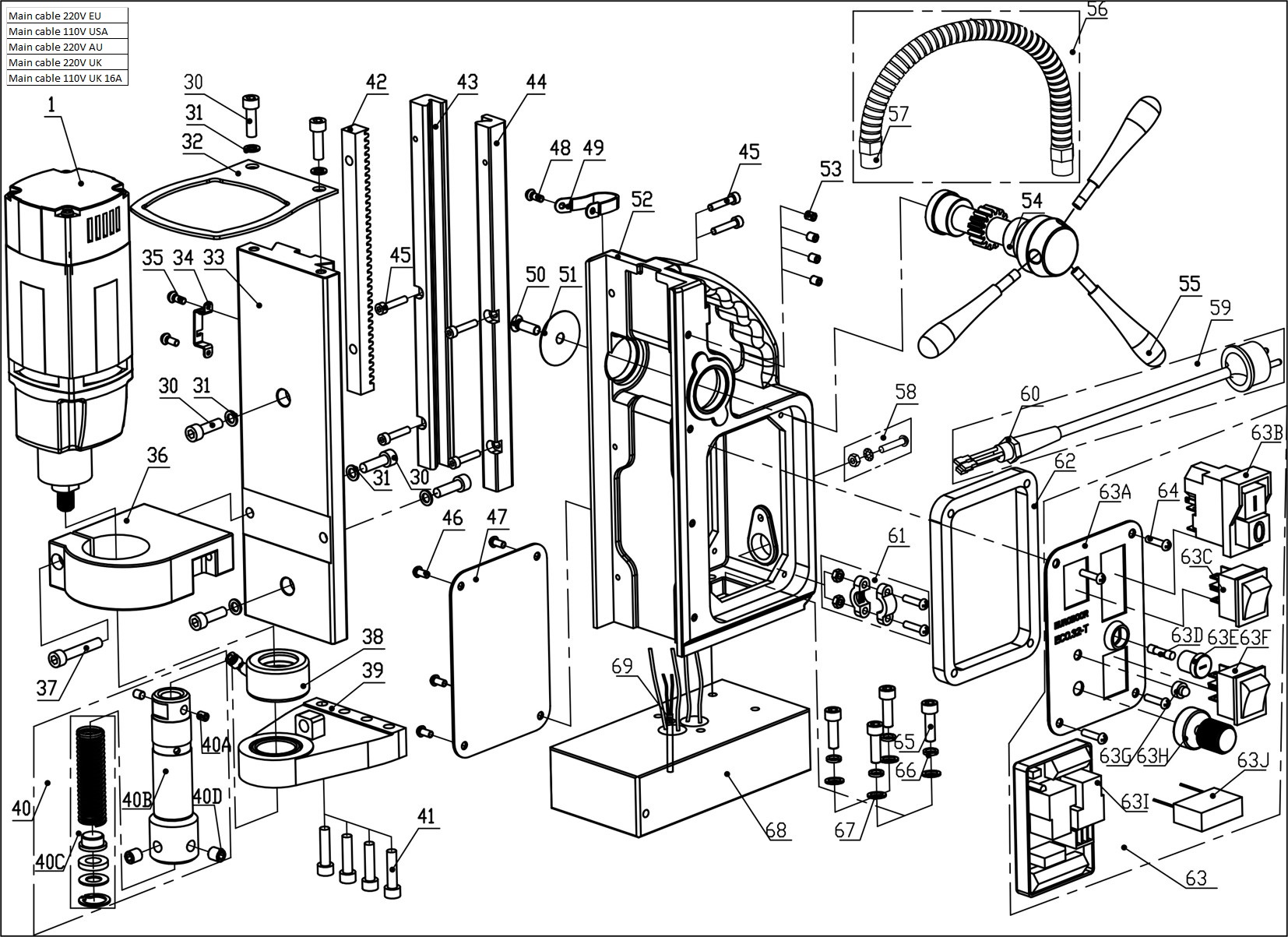 Magnetic drilling machine, annular cutters max. dia 32 millimeter, power supply tension 220 - 240 Volt, power supply frequency 50 - 60 Hertz, rotation direction bidirectional.