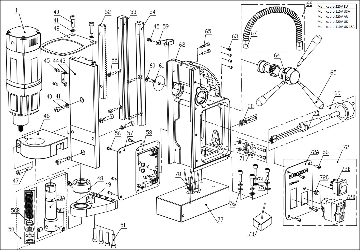 Magneet kernboormachine, kernboren max. dia 40 millimeter, voedingsbron spanning 220 - 240 Volt, draairichting rechtsom.