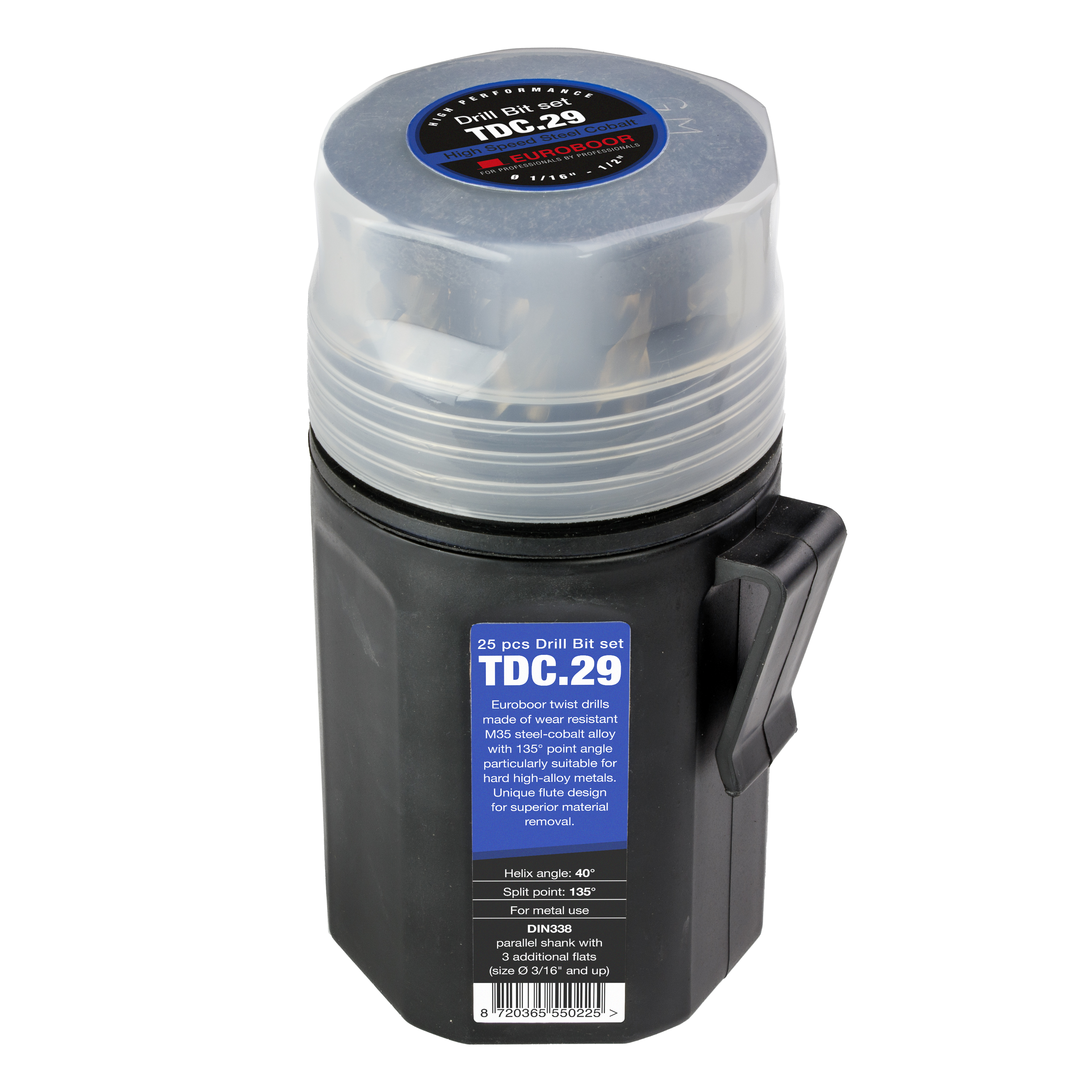 This Drill Bit set contains 29 HSS-CO (5%) twist drills with a 135° point angle for drilling in hard materials and high alloy steel. The high performance cutting edge ensures a very high aligned preciseness, particularly when hand-operated with a cordless drilling machine. Due to the reduced cutting forces you need less drilling power which makes your battery last longer! With the split point on our twist drills you get quick and simple precise spot-drilling without pre-centering. Even on ridged areas or materials!
